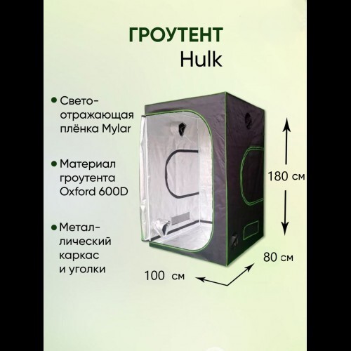 Гроутент изготовлен из высококачественного материала Mylar, обладающего очень эффективным отражением света 97%. Основой в палатке для выращивания растений является металлический каркас, изготовленный из стальных трубок диаметром 16 мм. Они крепятся между собой при помощи металлических уголков с защелками, что значительно увеличивает прочность и надежность конструкции. Преимущества growtent "Hulk" DU: